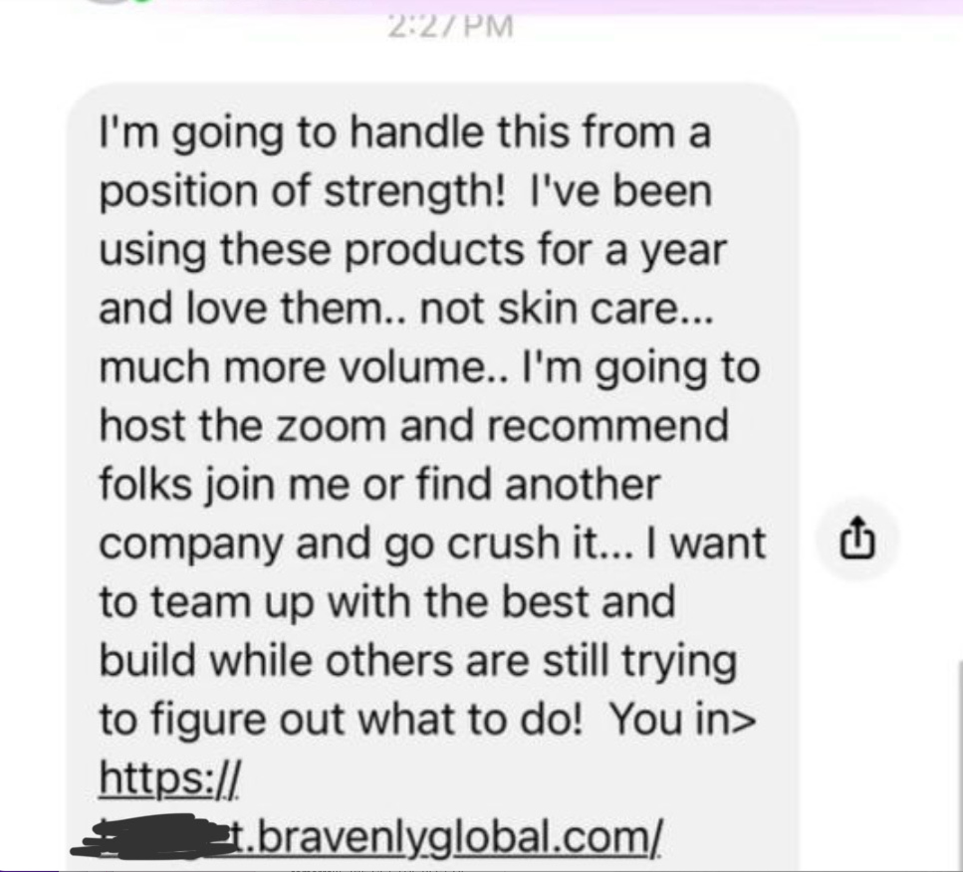 A: You should be scared! Tell her good luck, but know that she’s saying what she’s saying to try to recruit you. She may believe it all to be accurate, but the truth is, this can happen with any MLM company. Her ‘new gig’ may be seemingly skyrocketing now, but only because so many displaced reps from other companies have joined. Before too long, the same thing will happen to Shaklee, Bravenly, Olive Tree People, Beauty Society, or whichever other shiny penny is being flashed in your face right now. Please don’t join another MLM.